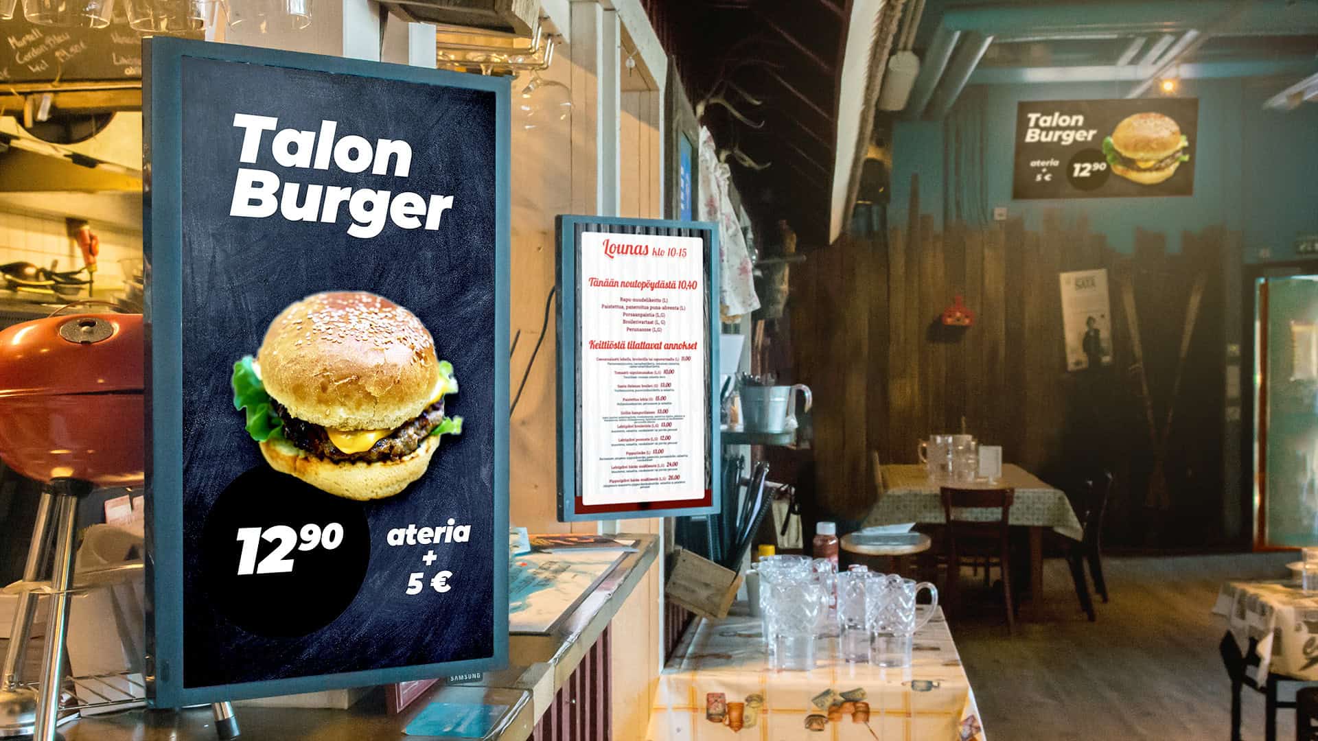 Menunäytöllä hoidat ravintolasi viestintätarpeet tehokkaasti. Selkeä tuoteinformaatio ja helppokäyttöinen sisällönhallinta mahdollistavat muuttuvien tuotteiden ja hintojen nopean sekä vaivattoman esittämisen. SeeSignagen sisällönhallintapalvelu mahdollistaa hallinnan puhelimella, tabletilla tai tietokoneelta. Kaikissa näytöissä on 3 vuoden on-site takuu. Monipuoliset telineratkaisut ja suunnittelu yhdessä kanssasi takaavat parhaan mahdollisen ravintolan ilmeen.
